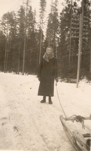 ![]() Ähtärissä toimineen limonaditehtaan tytöt Inhan aseman junamiehen kanssa. Kuvassa keskellä Sylvia Kangas 16-vuotiaana. Kuvan omistaa Ritva Vainio | ![]() Sylvia Kangas v. 1941 Pitkäahon vahtituvan edustalla. Kuvan omistaa Ritva Vainio |