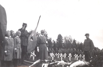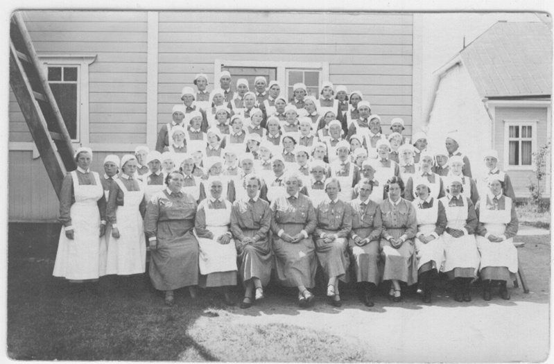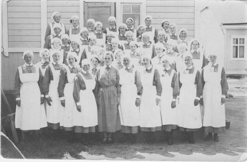 ![]() Muonitus- ja lääkärikurssi sota-aikana Tuomarniemellä. Kuvassa Olga Ritokangas toinen vasemmalta eturivissä. Kuvan omistaa Marttaa Viinikka | ![]() |