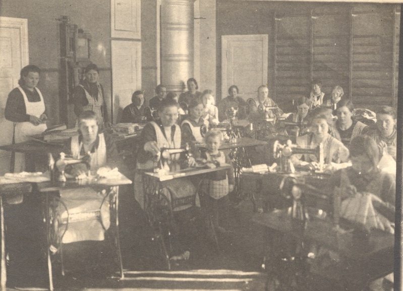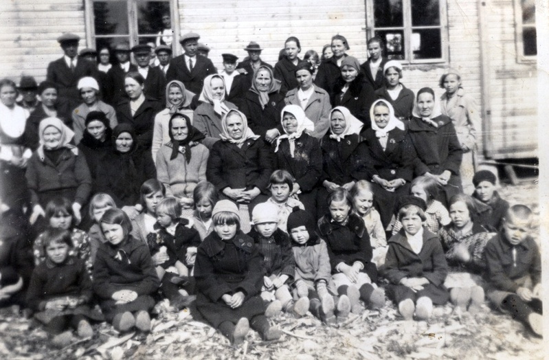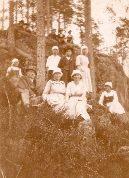 Muonituskurssi Tuomarniemellä. Kuvassa Olga Ritokangas viides oikealta eturivissä. Kuvan omistaa Martta Viinikka |  Perunankaivussa, noin vuonna 1916. Kuvassa Saima Toivola, Tammimetsä ja Edvard Suoverinaho ( Koivula- Korsumäki ) Rasin riihen luona. Kuvan omistaa Elli Isoaho |