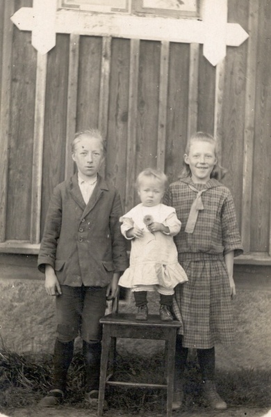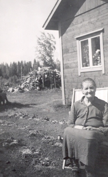 ![]() Väinö, Anna ja Sylvia Kangas Pitkäahon vahtituvan edustalla otetussa kuvassa 1920-luvulla. Kuvan omistaa Ritva Vainio | ![]() Julia Kangas. Kuvan omistaa Ritva Vainio |