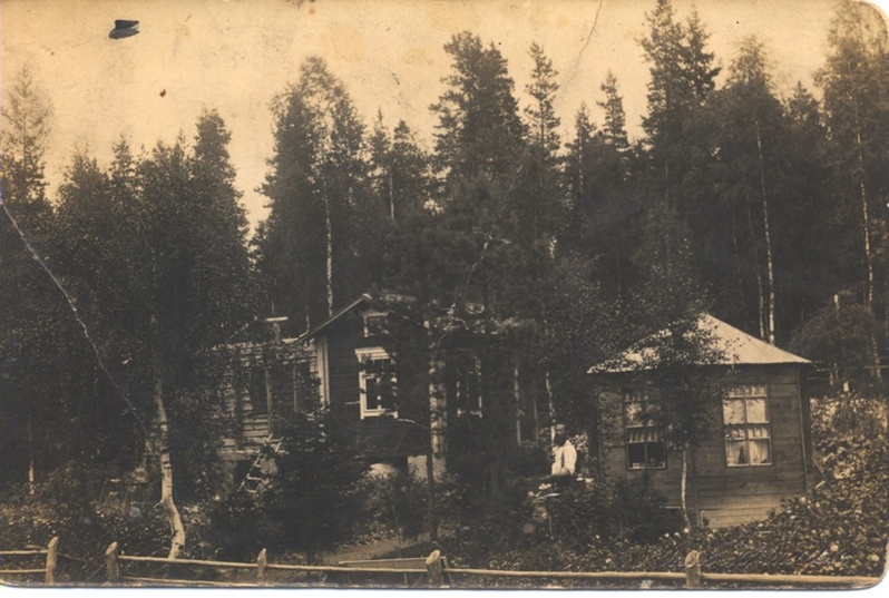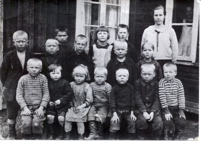 Aapo Tapaninmäki eli Setäläinen istuu mökkinsä edessä. Mökkiä kutsuttiin Setäläksi. |  Kiertokoulu Lampilassa v. 1927-1928. Opettaja Lyyli Panula |