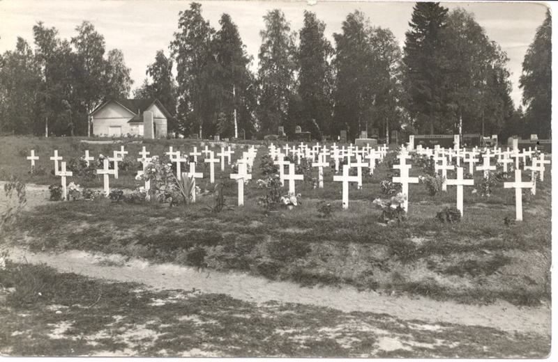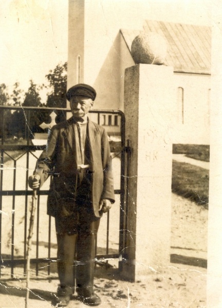 ![]() Ähtärin sankarihautausmaa, taustalla vanha siunauskappeli. Kuvan omistaa Ritva Vainio | ![]() Heikki Vainio työstämiensä kirkon portin kivipylväitten vieressä. Pylväissä kirjaimet HK. Kuvan omistaa Ritva Vainio |