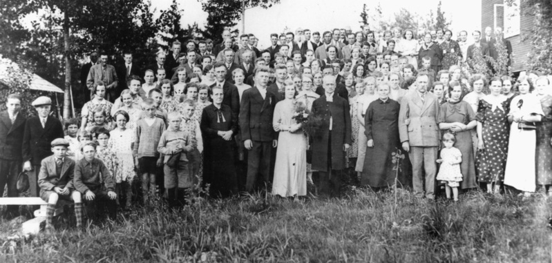 ![]() Eino Leppävuoren ja Martta Moision häät Ouluvedenkylän Ahonmäessä v. 1935. Kuvassa morsiamen vieressä rovasti v. Theodor v.Phaler ja morsiamen vanhemmat ja sulhasen vieressä Mimmi ( Vilhelmiina ) Leppävuori. Häissä oli runsaasti sulhasen ja morsiamen sukulaisia ja naapureita. | ![]() Karl Viktor Teivaanmäki s.1898. Kuvan omistaa Anna-Liisa Teivaanmäki |