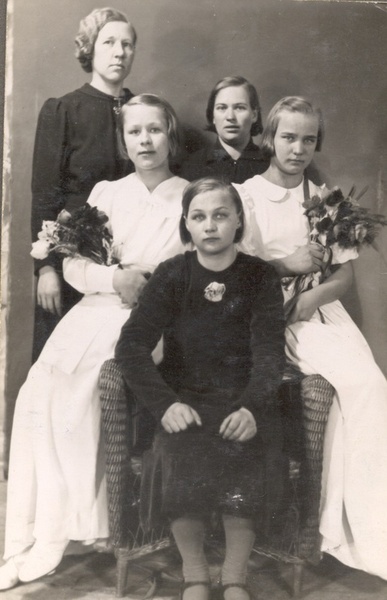![]() Sylvia os. Kangas ja Väinö Kangas uuden kotinsa edustalla v. 1949 Pitkäaholla Ähtärissä. Kuvan omistaa Ritva Vainio | ![]() Sylvia Kangas " omaisena " sisarensa Annan rippikuvassa. Sylvi vasemmalla ylhäällä, Anna istuu vasemmalla valkoisessa puvussa. Omaiset mustissa. Kuvan omistaa Ritva Vainio |